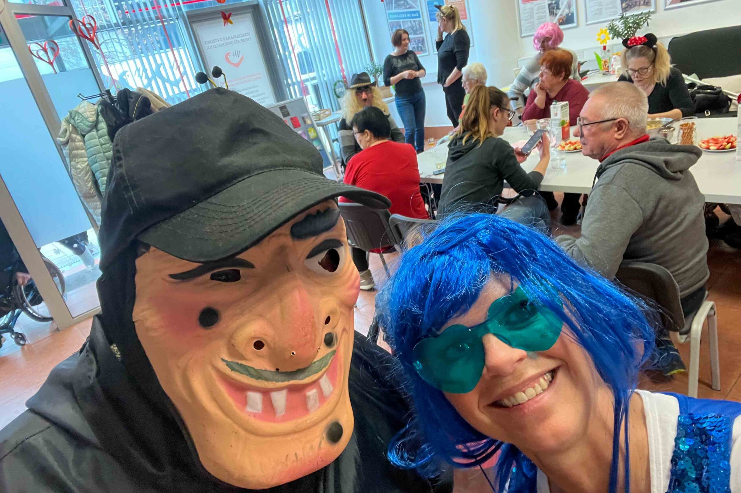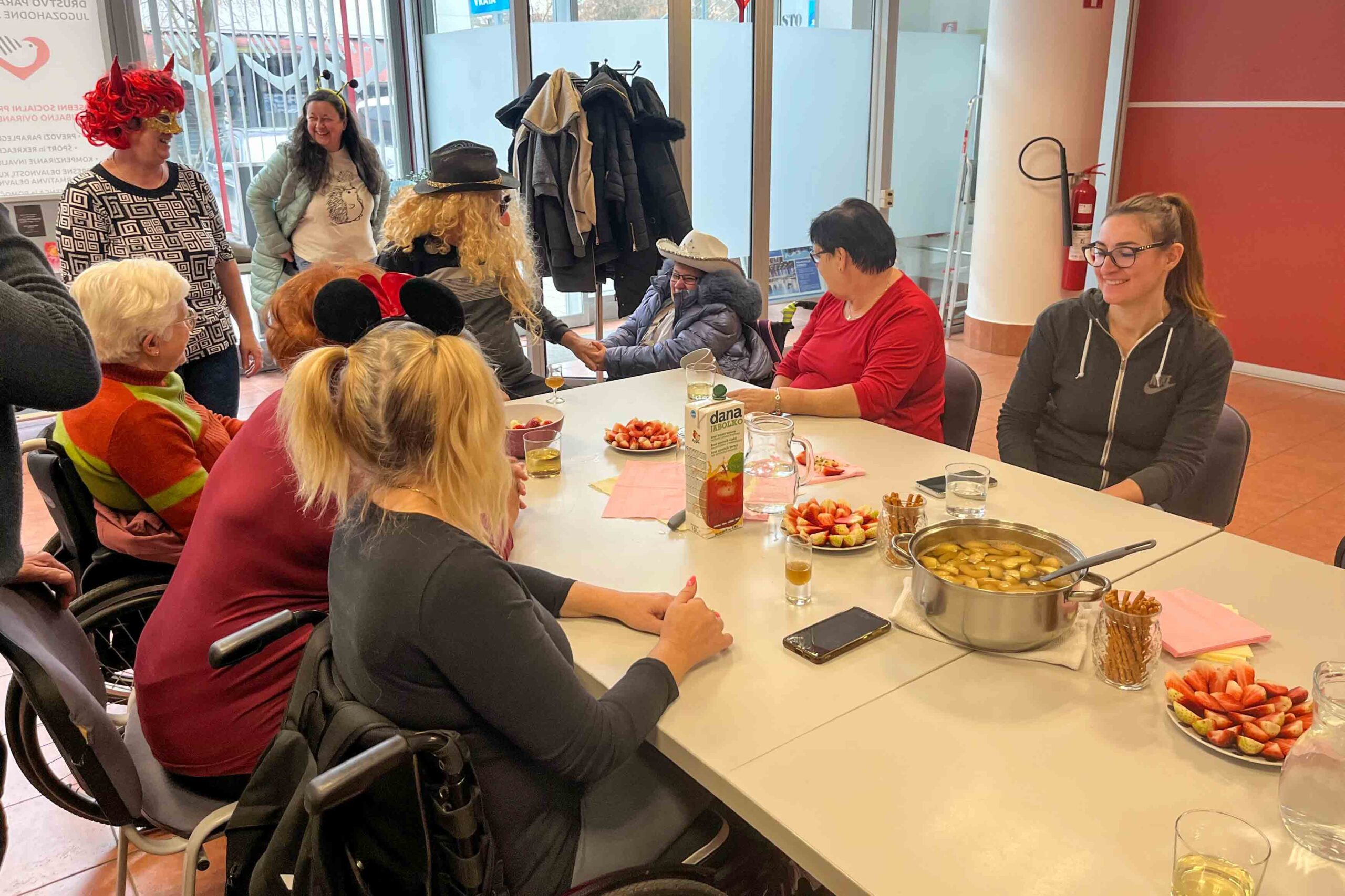 V prostoru je bilo čutiti pravo pustno vzdušje, saj smo bili številni udeleženci tudi maskirani. Med nami so bili člani društva, uporabniki OA s svojimi asistenti, kar je ustvarilo prijetno, odprto in povezovalno okolje. Skupaj smo zavihali rokave – naši člani so ob naši pomoči spekli obilico mišk in fritul, olje je veselo cvrčalo, prostor pa je napolnil neustavljiv vonj po domačih dobrotah. Vzdušje je bilo ves čas izjemno sproščeno, zabavno in norčavo. Med peko ni manjkalo smeha, prijaznih besed in dobre volje, ki se je prenesla tudi na skupno druženje ob mizi. Poleg sladkih dobrot smo si privoščili še jabolčni kompot, ki je odlično dopolnil pustno-valentinove okuse.